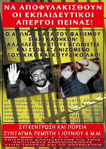 Για την άμεση απελευθέρωση των εκπαιδευτικων απεργών πείνας, Νουριγιέ Γκιουλμέν και Σεμίχ Οζακτσά, οι οποιοί βρίσκονται σε απεργία πείνας από τις 9 Μαρτίου.