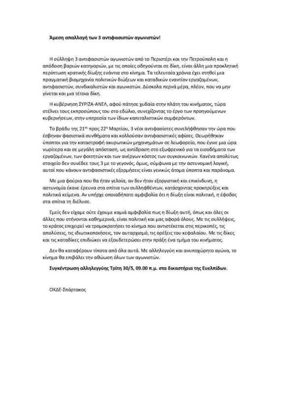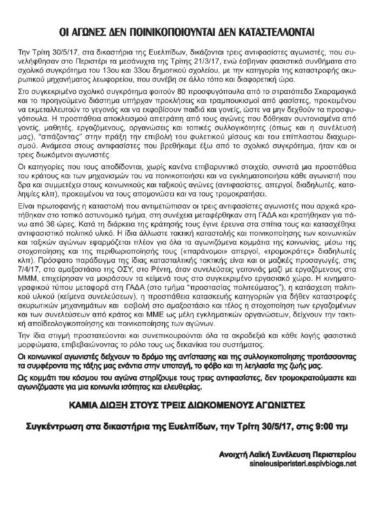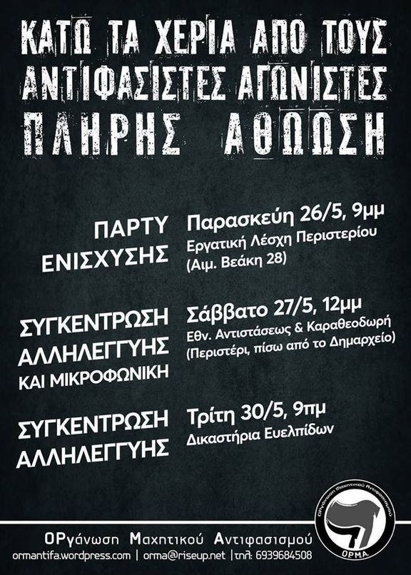 Η καμπάνια στήριξης των 3 αντιφασιστών θα πλαισιωθεί με συγκέντρωση αλληλεγγύης και μικροφωνική στις 27/05, 12μμ, Εθνικής Αντιστάσεων και Καραθεοδωρή στο Περιστέρι, πίσω από το δημαρχείο και θα καταλήξει με συγκέντρωση αλληλεγγύης την Τρίτη στις 30/05, 9πμ, στην Ευελπίδων. Ψηφίσματα στήριξης διαφόρων συλλογικοτήτων θα ανακοινωθούν σύντομα.