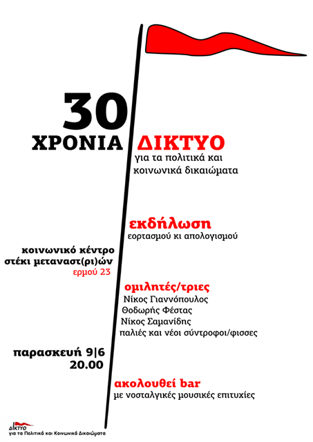 Τα 30 χρόνια Δικτύου για Πολιτικά και Κοινωνικά Δικαιώματα θα γιορταστούν και στη Θεσσαλονίκη. Εντάξει, δε θα κατεβάσουμε κλαρίνα και νταούλια, αλλά θα κάνουμε μια καλή συνάντηση των παλιών και των νέων, των εντός και των παράλληλα, όσων επιμένουν αλλά κι όσων μπορεί να αποφάσισαν κάποια στιγμή πως το όχημα που τους ταιριάζει είναι κάποιο άλλο.