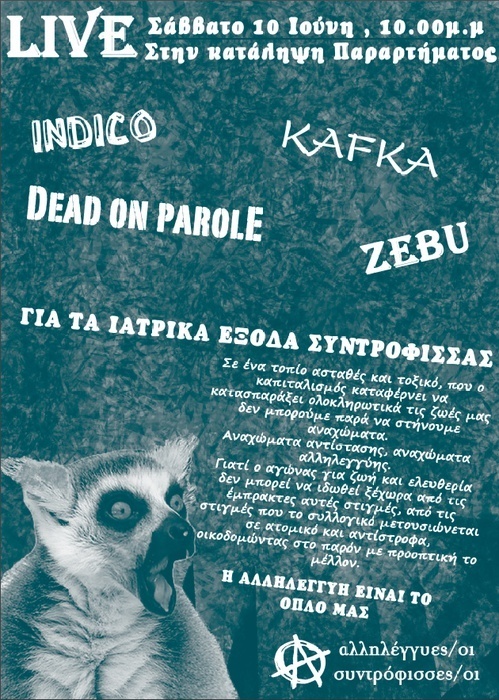 LIVE οικονομικής ενίσχυσης για τα ιατρικά έξοδα συντρόφισσας με τους INDICO, KAFKA, DEAD ON PAROLE ΚΑΙ ZEBU