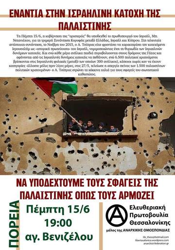 Καλούμε τους ανθρώπους που ποθούν δικαιοσύνη και ειρήνη στη γειτονιά μας να διαδηλώσουν αύριο ΠΕΜΠΤΗ 15/6 και ώρα 7:00 μ.μ. στη ΘΕΣΣΑΛΟΝΙΚΗ (Άγαλμα Βενιζέλου) και την ΑΘΗΝΑ (ισραηλινή πρεσβεία).