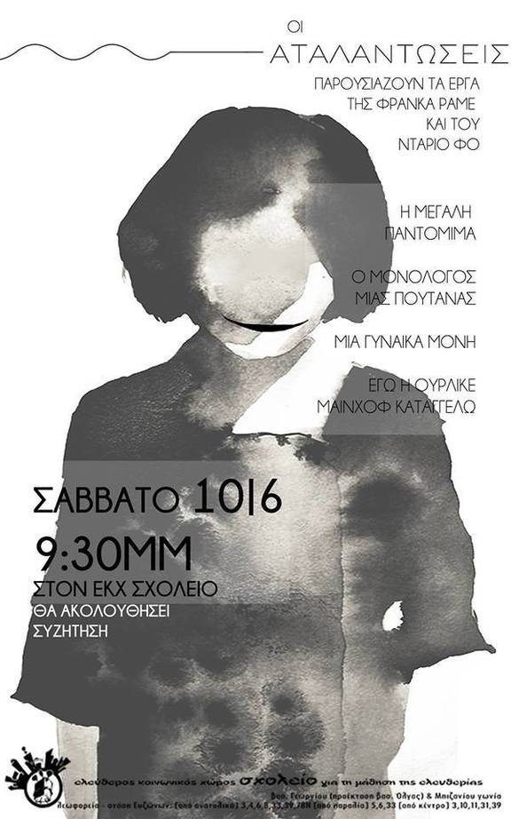 Η θεατρική ομάδα Αταλαντώσεις του ε.κ.χ. Σχολείο, παρουσιάζουν τρεις μονολόγους και ένα μονόπρακτο του Ντάριο Φο και της Φράνκα Ράμε: Η μεγάλη παντομίμα, Ο μονόλογος μιας πουτάνας, Εγώ η Ουρλίκε Μάινχοφ καταγγέλλω και Μια γυναίκα μόνη.