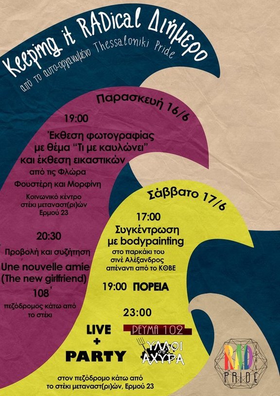 Ως RADical Pride παρεμβαίνουμε στο 6ο Thessaloniki Pride, αλλά την ίδια στιγμή ξέρουμε πως τίποτα δεν τελειώνει εκεί. Θα συνεχίσουμε να δρούμε με κριτήριο ότι η διαφορετικότητα είναι για εμάς πλούτος και ότι η σύνδεση των επιμέρους κινημάτων είναι η μόνη δυνατή απάντηση για έναν κόσμο χωρίς καταπίεση, χωρίς βία και χωρίς διακρίσεις.