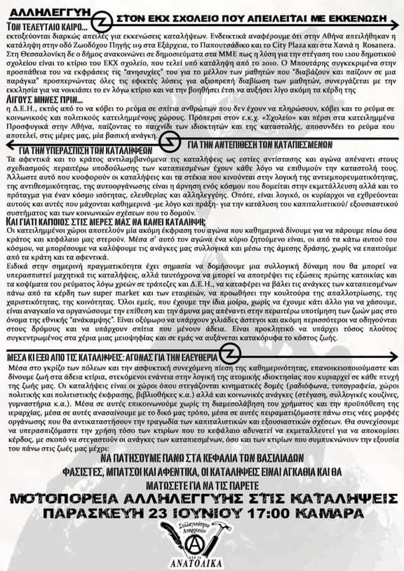 Ενάντια στην ομοιομορφία του αστικού τοπίου δημιουργούμε πυρήνες ανομίας διαταράσσοντας την κανονικότητα των μητροπόλεων. Ενωμένοι λοιπόν θα απαντάμε σε κάθε απειλή που δέχονται οι καταλήψεις. Δεν πρόκειται να επιτρέψουμε τις επιθέσεις και τις απειλές του κράτους και των μηχανισμών του. Γι' αυτό στεκόμαστε αλληλέγγυοι στον ε.κ.χ Σχολείο και σε όλες τις καταλήψεις που έχουν δεχτεί και δέχονται την καταστολή του κράτους.