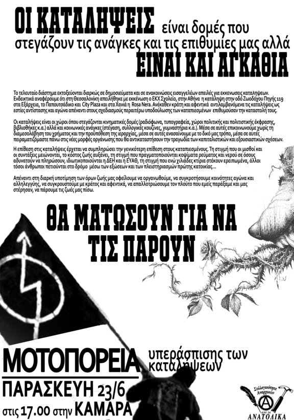 αλληλεγγύη στις καταλήψεις στη Ρόζα Νέρα, στο Παπουτσάδικο, στον Ε.Κ.Χ Σχολείο, στις καταλήψεις στέγης μεταναστριών, σε όσες δεν υπάρχουν πια σαν κτίρια και σε όσες θα εμφανιστούν στο μέλλον