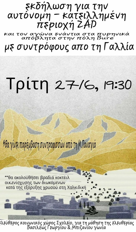 ** μετά την εκδήλωση θα ακολουθήσει βραδιά κοκτέιλ οικ.ενίσχυσης των διωκόμενων κατά της εξόρυξης χρυσού στη Χαλκιδική