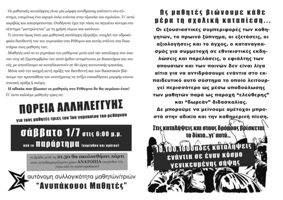 …στις 18.00 από το παράρτημα καλεί η αυτόνομη συλλογικότητα μαθητών/τριών ΑΝΥΠΑΚΟΥΟΙ ΜΑΘΗΤΕΣ. Στις 21.30 θα ακολουθήσει πάρτι στον αυτοδιαχειριζόμενο χώρο ΑΝΑΤΟΠΙΑ.