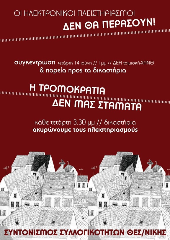 Είναι φανερή και από τις μεθόδους που ακολούθησαν και από τα αδικήματα που προσάπτουν στους εγκαλούμενους η προσπάθεια από την πλευρά κυβέρνησης και κατασταλτικών μηχανισμών να τρομοκρατήσουν το κίνημα. Όμως η προσπάθειά τους θα πέσει για άλλη μια φορά στο κενό! Το κίνημα ενάντια στους πλειστηριασμούς όχι μόνο δεν τρομοκρατείται αλλά δυναμώνει και θα δώσει μια πρώτη δυναμική απάντηση την Τετάρτη 14 Ιουνίου, με τη συγκέντρωση (1μ.μ., στη ΔΕΗ κεντρ. Θεσ/νίκης-ΧΑΝΘ) και πορεία προς τα δικαστήρια για την εκ νέου ακύρωση των πλειστηριασμών με την μαζική παρουσία διαδηλωτών.