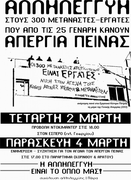 - ΠΑΡΑΣΚΕΥΗ 4/3 στις 17.00 - ενημέρωση-συζήτητση για τον αγώνα των μεταναστών εργατών απεργών πείνας στο Παράρτημα (Κορίνθου κ Αράτου