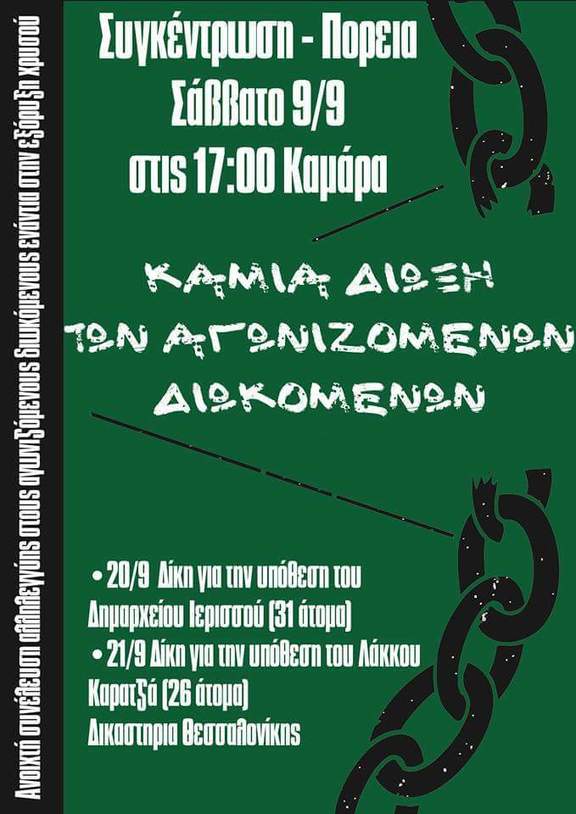 - Βιομηχανία διώξεων ενάντια σε όσους αγωνίζονται, όπως στις Σκουριές, και κατασκευασμένα κατηγορητήρια με βάση το «αντι»τρομοκρατικό καθεστώς έκτακτης ανάγκης, όπως στην υπόθεση της Ηριάννας και του Περικλή και σε πλήθος αγωνιστών καθώς και ειδικές συνθήκες κράτησης για τους πολιτικούς και αγωνιζόμενους κρατούμενους.