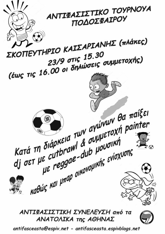 Αντιφασιστικό τουρνουά ποδοσφαίρου με DJ Set & Bar οικονομικής ενίσχυσης στο Σκοπευτήριο της Καισαριανής(πλάκες) το Σάββατο 23/9 στις 15.30(15.30-16.00 οι δηλώσεις συμμετοχής των ομάδων).