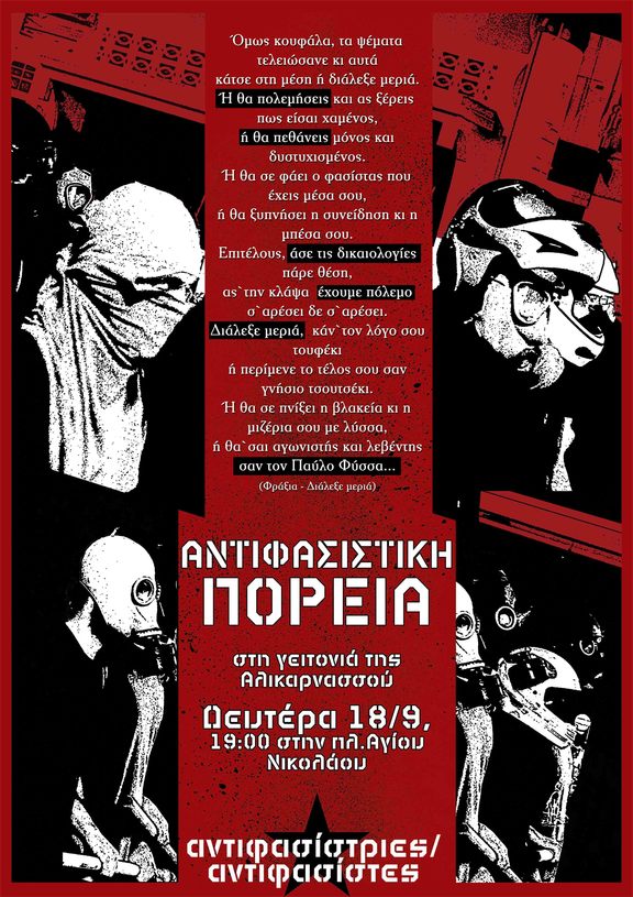 Αντιφασιστική πορεία στη γειτονιά της Αλικαρνασσού 18/9 -ώρα: 19:00 στην πλατεία Αγ.Νικολάου | Συνέλευση για τη διοργάνωση της Αντιφασιστικής Πορείας 15/9/17 στις 19:00