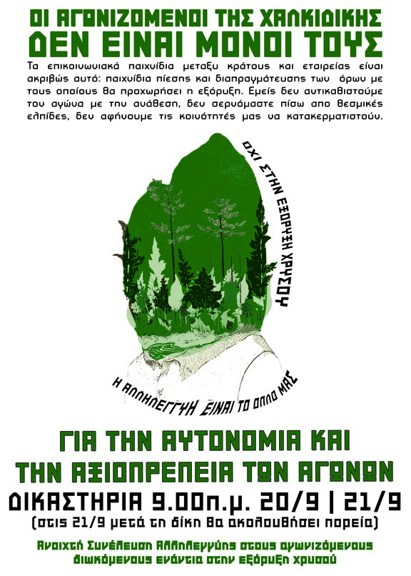 Η αλληλεγγύη στους διωκόμενους αγωνιζόμενους και η στήριξη των κοινωνικών αντιστάσεων ενάντια στα σχέδια του κράτους και των αφεντικών της «Ελληνικός Χρυσός» αποτελεί το μόνο όπλο και το πιο ισχυρό ανάχωμα στην επιθετικότητα της εξουσίας. Σε αυτά τα πλαίσια, στεκόμαστε δυναμικά δίπλα στους αγώνες των κατοίκων και αντιστεκόμαστε μαζί τους. Ωστόσο, όπως συμβαίνει σε διάφορους τοπικούς ή κεντρικούς κοινωνικούς αγώνες, έτσι και στον αγώνα της Χαλκιδικής ενάντια στην εξόρυξη χρυσού, εμπεριέχονται και αρκετές αντιφάσεις. Σε μια κοινωνία χωρίς προηγούμενη κινηματική εμπειρία, είναι λογικό και αναμενόμενο ο εκβιασμός που επιβάλλεται από το κράτος να έχει ενίοτε ως αποτέλεσμα την τρομοκράτηση των διωκόμενων, που προκαλεί άλλοτε διαχωρισμούς σε επίπεδο νομικής υπεράσπισης και άλλοτε προσπάθειες παγώματος των κινηματικών διαδικασιών της αλληλεγγύης έχοντας σε ένα βαθμό οδηγήσει σε μερική αποδυνάμωση του ίδιου του αγώνα.
