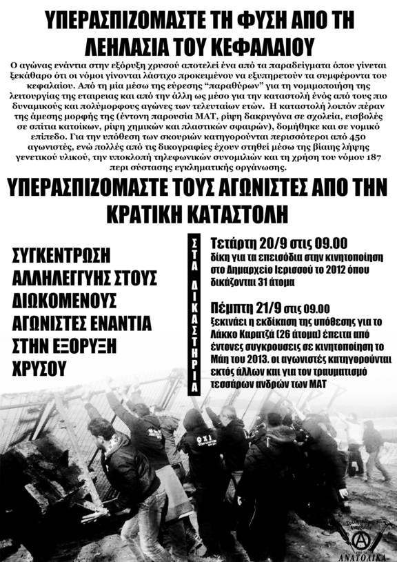 Συγκεντρώσεις αλληλεγγύης για τους διωκόμενους αγωνιστές ενάντια στην εξόρυξη χρυσού