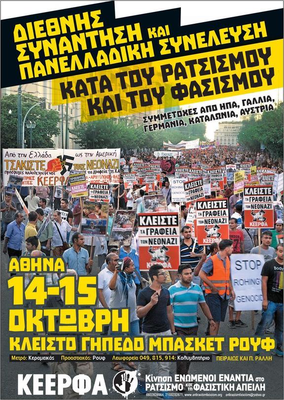 Η δίκη της Χρυσής Αυγής μπαίνει στη τελική ευθεία και εμείς δείξαμε ότι μπορούμε να τους τσακίσουμε. Η διεθνής συνάντηση και η πανελλαδική συνέλευση κατά του ρατσισμού και του φασισμού στις 14-15 Οκτώβρη είναι ο επόμενος σταθμός για να συνεχίσουμε νικηφόρα. Θα βρεθούν μαζί μας ακτιβιστές από όλη την Ελλάδα αλλά και από τις ΗΠΑ, την Γερμανία, την Γαλλία, τη Βρετανία, την Καταλονία, την Αυστρία και άλλες χώρες για να συζητήσουμε και να οργανώσουμε μαζί τις νέες μάχες.