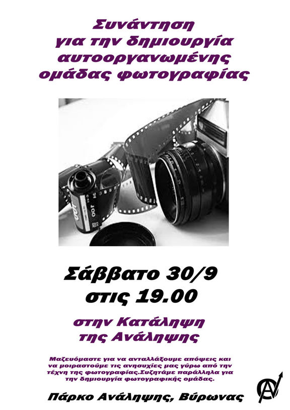 Μαζευόμαστε για να ανταλλάξουμε απόψεις και να μοιραστούμε τις ανησυχίες μας γύρω από την τέχνη της φωτογραφίας.Συζητάμε παράλληλα για την δημιουργία φωτογραφικής ομάδας.Στην κατάληψη της Ανάληψης στον Βύρωνα.Πρόσβαση: ΛΕΩΦ.203 204-054(ΑΓΟΡΑ ΒΥΡΩΝΑ). 732(9η ΦΟΡΜΙΩΝΟΣ). ΤΡΟΛΛΕΥ 11 (ΑΓΟΡΑ ΒΥΡΩΝΑ).