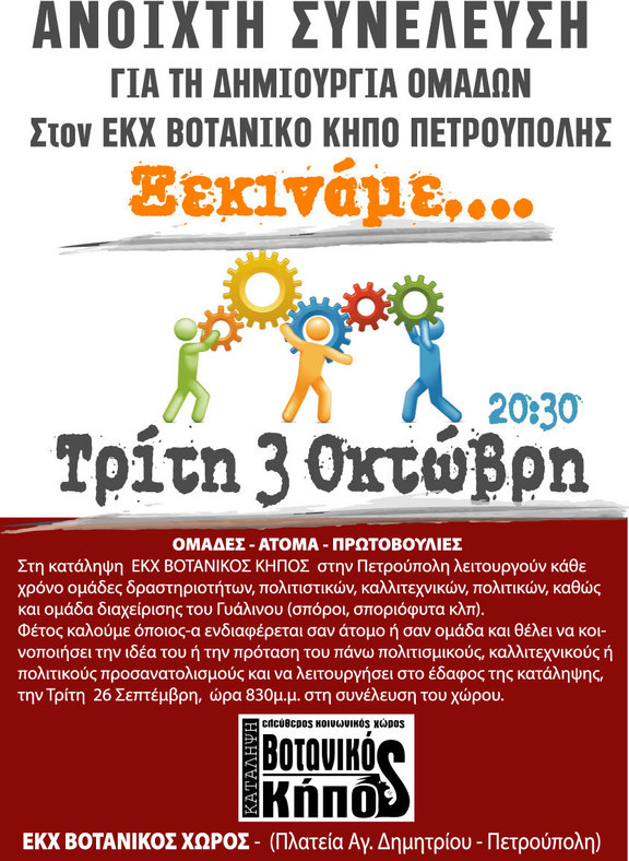 ΑΝΟΙΧΤΗ ΣΥΝΕΛΕΥΣΗ ΓΙΑ ΤΗ ΔΗΜΙΟΥΡΓΙΑ ΟΜΑΔΩΝ στον ΕΚΧ ΒΟΤΑΝΙΚΟ ΚΗΠΟ ΠΕΤΡΟΥΠΟΛΗΣ