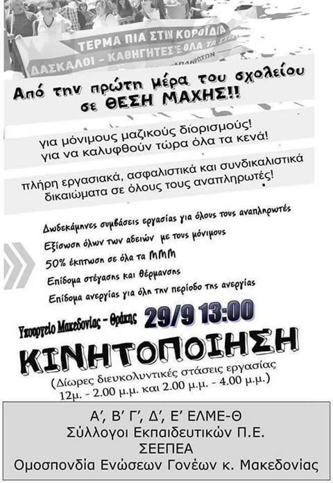 Ο ΣΥΛΛΟΓΟΣ ΦΟΙΤΗΤΩΝ ΙΣΤΟΡΙΑΣ-ΑΡΧΑΙΟΛΟΓΙΑΣ συμμετέχει στην αυριανή συγκέντρωση, ΠΑΡΑΣΚΕΥΗ στις 13:00 στο ΥΠΟΥΡΓΕΙΟ ΜΑΚΕΔΟΝΙΑΣ ΘΡΑΚΗΣ, που καλούν οι ΕΛΜΕ Θεσσαλονίκης-οι σύλλογοι εκπαιδευτικών Πρωτοβάθμιας Εκπαίδευσης- ο σύλλογος των εκπαιδευτικών της ειδικής αγωγής- η ομοσπονδία γονέων Μακεδονίας.