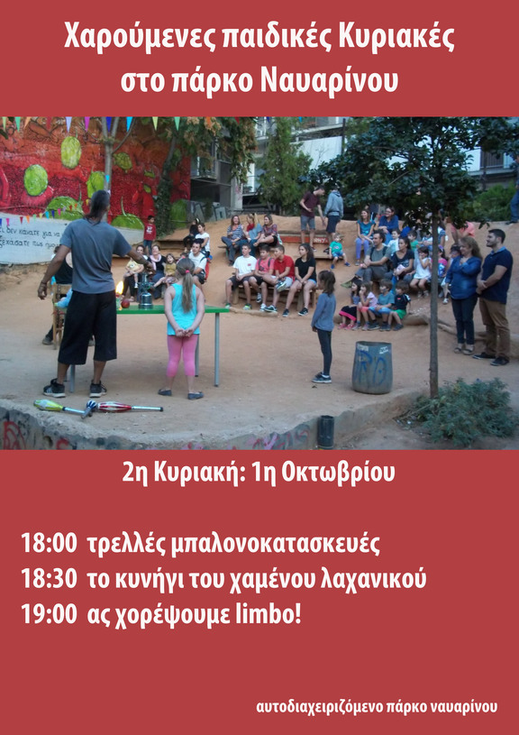 Και αυτή την Κυριακή 1 Οκτωβρίου συνεχίζουμε τις χαρούμενες παιδικές Κυριακές στο Πάρκο Ναυαρίνου με μπαλονοκατασκευές, το Κυνήγι του Χαμένου Λαχανικού και ένα χορό limbo κάτω από το σκουπόξυλο! Από τις 6 το απόγευμα, καιρού επιτρέποντος, θα είμαστε όλοι εκεί.