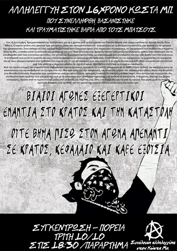 Ξημερώματα 17/9 και τέσσερα χρόνια από την δολοφονία Φύσσα, στον απόηχο των κινητοποιήσεων, συλλαμβάνεται από αστυνομικούς στον χώρο των Εξαρχείων, μεταξύ άλλων, ο 16χρονος Κώστας Μπ. Κατά την σύλληψή του, αλλά και καθ'όλη τη διάρκεια της μεταφοράς του στο τμήμα, ο συλληφθέντας βασανίζεται και ξυλοκοπείται από τους δεσμώτες του, στη συνέχεια έξω από την ΓΑΔΑ καταφέρνει να τους ξεφύγει δεμένος πισθάγκωνα, έως ότου χτυπηθεί από διερχόμενο αυτοκίνητο στην Λ. Αλεξάνδρας. Ως απάντηση σ' αυτήν του την κίνηση δέχεται χτύπημα από κλόμπ στο κεφάλι και στην συνέχεια μεταφέρεται στο ΚΑΤ, χωρίς να του αφαιρεθούν οι χειροπέδες, σε κρίσιμη κατάσταση για την υγεία του, με πολλαπλά τραύματα στα άκρα του, όπου και τίθεται από τους γιατρούς σε τεχνική υποστήριξη. Η αστυνομία δε φεύγει από το θάλαμο νοσηλείας του, παρά μόνο έπειτα από καταγγελία του συνδικαλιστικού οργάνου των γιατρών. Τις επόμενες μέρες ξετυλίγεται ένα κουβάρι αποσιώπησης και εφησυχασμού από ΜΜΕ, αστυνομία και κυβερνητικές φυλλάδες, σε σχέση με την κατάσταση της υγείας του κρατουμένου, που έρχεται σε αντίθεση με το επίσημο ιατρικό ανακοινωθέν, ενώ ακόμα και η ενημέρωση των συγγενών του είναι ελλιπής. Η πίεση της αστυνομίας μέσα στο νοσοκομείο είναι διαρκής σε βαθμό που και οι διοικούντες του νοσοκομείου σε ενημέρωσή τους αναφέρουν χαρακτηριστικά «ξέρετε πως είναι αυτά...κουμάντο κάνει η αστυνομία». Πλέον η κατάσταση της υγείας του Κώστα έχει σταθεροποιηθεί και στις 21/9 βγαίνει από το τεχνητό κώμα. Στις 25/9 ο 16χρονος πέρασε από ανακριτή μέσα στο νοσοκομείο και αντιμετωπίζει βαριές κατηγορίες κακουργηματικού χαρακτήρα, ενώ από την μεριά της αστυνομίας διαρρέεται η πληροφορία και για λήψη DNA.