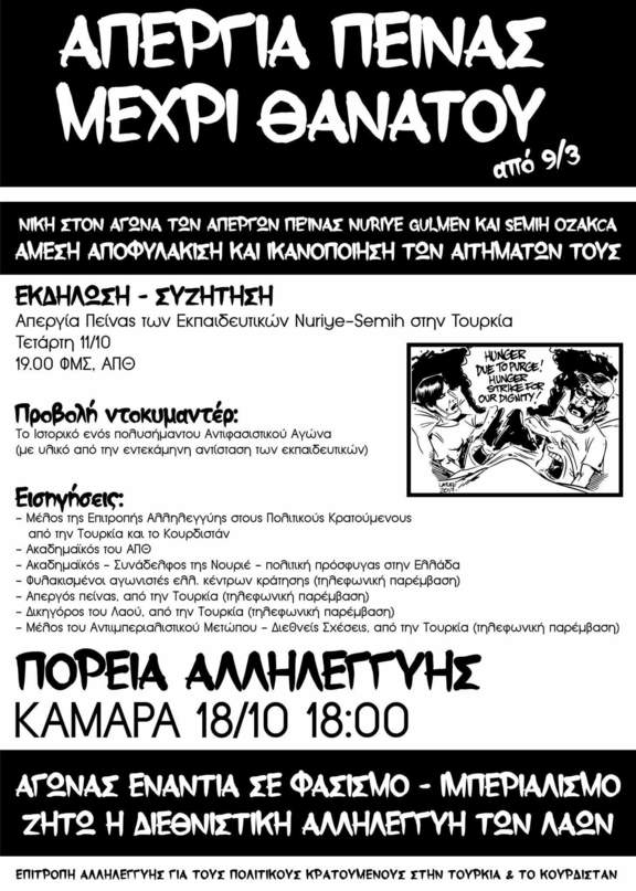 Στα πλαίσια της διεθνιστικής αλληλεγγύης στηρίζουμε τον δίκαιο αγώνα των τούρκων απεργών πείνας.