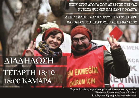 Ως κομμάτι των καταπιεσμένων και των εκμεταλλευόμενων εκφράζουμε την αμέριστη αλληλεγγύη μας στη Nuriye και τον Semih και σε όσους αγωνίζονται ενάντια στο ολοκληρωτικό καθεστώς του Ερντογάν. Η δημιουργία και η ενδυνάμωση δεσμών διεθνιστικής αλληλεγγύης, σε συνδυασμό με την ταυτόχρονη κοινωνική και ταξική οργάνωση και αντεπίθεση από τη βάση είναι αυτές που μπορούν να μας αποδεσμεύσουν από την τυραννία του κράτους και του κεφαλαίου. Οι προλετάριοι όλων των χωρών δεν έχουμε τίποτα να χωρίσουμε μεταξύ μας. Βρισκόμαστε στο ίδιο ταξικό στρατόπεδο, παρά τα όσα διαγγέλλουν οι αστικές αφηγήσεις, που θέλουν να διαιωνίσουν την πολιτική ανελευθερία και την οικονομική εκμετάλλευση των από τα κάτω, προς όφελος των κυρίαρχων. Οφείλουμε να απαντήσουμε λοιπόν στην κρατική και καπιταλιστική βαρβαρότητα που καταδυναστεύει τις ζωές μας και μας ξεζουμίζει καθημερινά, οργανώνοντας και διεξάγοντας ακηδεμόνευτα την κοινωνική επανάσταση για την παγκόσμια χειραφέτηση των πληβειακών στρωμάτων, που θα σημάνει τη γενικευμένη κοινωνική αυτοδιεύθυνση.