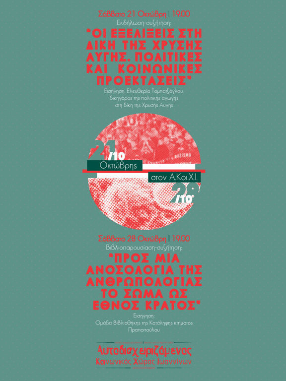 Εκδήλωση-συζήτηση: «Οι εξελίξεις στη δίκη της Χρυσής Αυγής. Πολιτικές και κοινωνικές προεκτάσεις.» Την εισήγηση θα κάνει η Ελευθερία Τομπατζόγλου, δικηγόρος της πολιτικής αγωγής στη δίκη της Χρυσής Αυγής.
