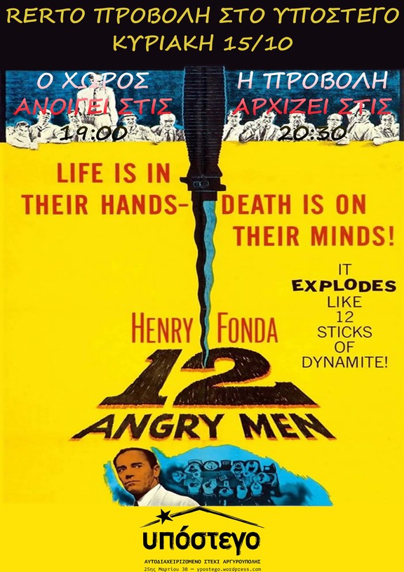 Την Κυριακή 15/10 στις 20:30 προβολή της ταινίας 12 Angry Men (Sidney Lumet).
