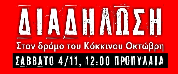 Τιμάμε την 100ή επέτειο της μεγάλης Οκτωβριανής Επανάστασης διαδηλώνοντας στο κέντρο της Αθήνας. Στέλνουμε μήνυμα συνέχισης του αγώνα για την ανατροπή του καπιταλισμού και της βαρβαρότητάς του. Για την επικαιρότητα της εναλλακτικής λύσης του Σοσιαλισμού, που θέτει στο επίκεντρο μια σχεδιασμένη παραγωγή και οικονομία, τα εργατικά και κοινωνικά δικαιώματα, την εργατική δημοκρατία, τον άνθρωπο και τις ανάγκες του, τη σωτηρία από τον εφιάλτη του πολέμου και της οικολογικής καταστροφής.