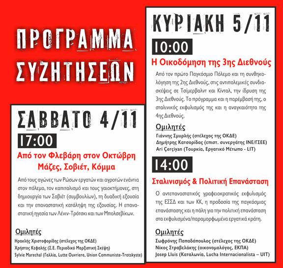 Τιμάμε τους μαρξιστές επαναστάτες Μπολσεβίκους, με επικεφαλής τους Λένιν και Τρότσκι, που οδήγησαν το ρωσικό λαό στη νίκη ενάντια στον τσαρισμό, τον καπιταλισμό, τον ιμπεριαλισμό.