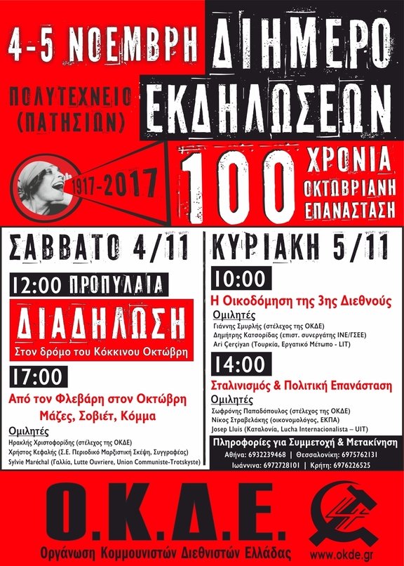 Η ΟΚΔΕ τιμά την 100ή επέτειο της μεγάλης Οκτωβριανής Επανάστασης στη Ρωσία το 1917 με διήμερο εκδηλώσεων και συζητήσεων στην Αθήνα στις 4 και 5 Νοεμβρίου.