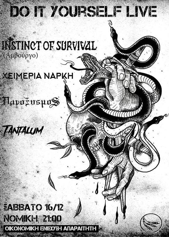 Το Σάββατο 16 του Δεκέμβρη οι crust γίγαντες Instinct of Survival από το Αμβούργο συναντούν τους δικούς μας Χειμερία Νάρκη για ενα live σκότωμα. Μαζι τους οι crust/ grind freaks Παροξυσμός και οι θορυβώδεις tantalum. Το live ξεκινάει στις 21.00 και η οικονομική ενίσχυση είναι απαραίτητη.