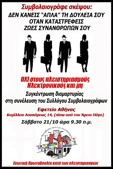 Η Ενωτική Πρωτοβουλία κατά των Πλειστηριασμών καλεί το Σάββατο 21/10, στις 9.30 πμ, σε αγωνιστική παρέμβαση μπροστά στο Εφετείο της Αθήνας, όπου πρόκειται να πραγματοποιηθεί η Γενική Συνέλευση του Συμβολαιογραφικού Συλλόγου Αθήνας- Πειραιώς- Αιγαίου - Δωδεκανήσων, με θέμα τους ηλεκτρονικούς πλειστηριασμούς.
