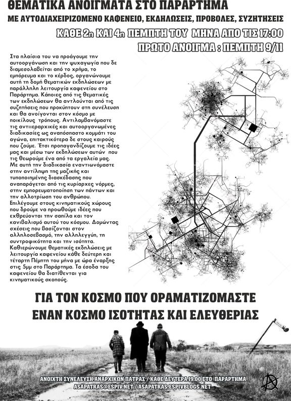 Θεματικό άνοιγμα στο Παράρτημα με αυτοδιαχειριζόμενο καφενείο, εκδηλώσεις, προβολές, συζητήσεις