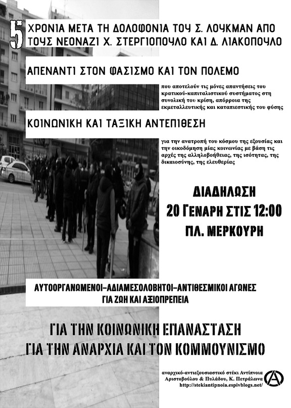 Πέντε χρόνια μετά τη δολοφονία του Σ. Λουκμάν και του Π. Φύσσα οι δεκάδες τραυματισμένοι/ες από τα μαχαίρια των φασιστών, οι εμπρησμοί καταληψιών στέγης μεταναστών και χώρων του κινήματος και οι εκκενώσεις που ακολούθησαν, η αγαστή συνεργασία φασιστών και αστυνομίας εναντίον του κόσμου του αγώνα μας υπενθυμίζουν ότι ο αντιφασιστικός αγώνας δεν μπορεί παρά να είναι αντιθεσμικός, ταξικός και ανατρεπτικός πάντα σε πείσμα και ενάντια σε κάθε εξουσία. Αυτά τα πέντε χρόνια μας υπενθυμίζουν ότι ο αντιφασιστικός αγώνας είναι αγώνας ενάντια στο κράτος και την καπιταλιστική βαρβαρότητα, κομμάτι του αγώνα για την ανατροπή του κόσμου της καταπίεσης και της εκμετάλλευσης, κομμάτι του αγώνα για ένα κόσμο ισότητας, αλληλεγγύης, δικαιοσύνης και ελευθερίας.