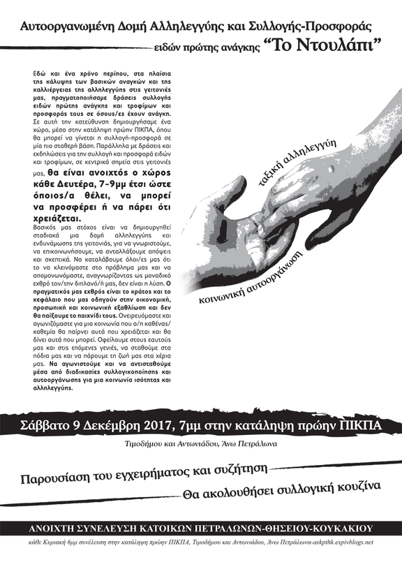 Σάββατο 9 Δεκέμβρη 2017 παρουσίαση της Αυτοοργανωμένη Δομή Αλληλεγγύης και Συλλογής-Προσφοράς ειδών πρώτης ανάγκης "Το Ντουλάπι"