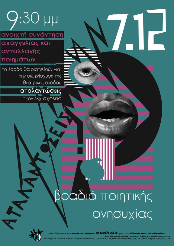 Τα έσοδα θα διατεθούν για την οικ. ενίσχυση της θεατρικής ομάδας Αταλαντώσεις στον εκχ σχολειο.