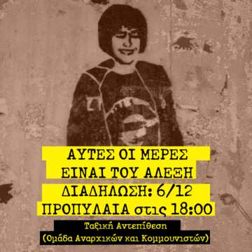 Ενάντια στην εδραίωση των κατασταλτικών μηχανισμών και στην εντεινόμενη φτωχοποίησή μας, αλλά και στα σχέδια του κράτους να βάλει εμπόδιο στην κήρυξη απεργιών, διαδηλώνουμε στη μνήμη του Αλέξη, γιατί χωρίς μνήμη δεν υπάρχει και μέλλον.