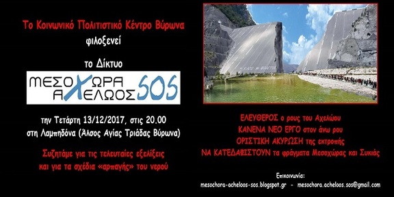 Το Κοινωνικό Πολιτιστικό Κέντρο Βύρωνα φιλοξενεί το Δίκτυο Μεσοχώρα-Αχελώος SOS, την Τετάρτη 13 Δεκεμβρίου ΄17, στις 8 μμ, στη Λαμπηδόνα (Άλσος Αγίας Τριάδας Βύρωνα). Συζητάμε, για τις τελευταίες εξελίξεις και τα σχέδια αρπαγής του νερού.
