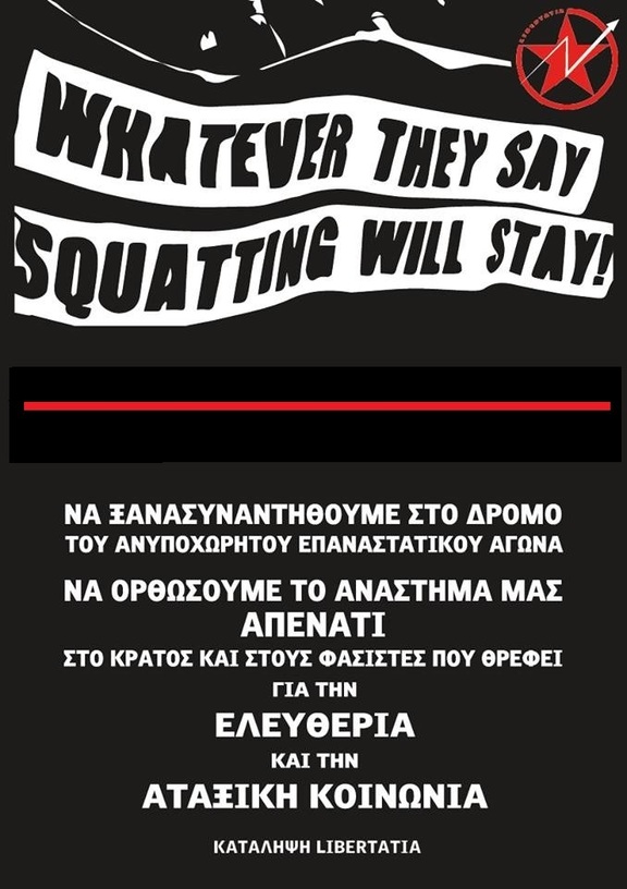 Αυτή τη φορά, οι εισαγγελικές και αστυνομικές αρχές ενεργώντας στο πλαίσιο της πάγιας κρατικής πολιτικής επιχειρούν να στήσουν έναν κατασταλτικό κλοιό γύρω από την κατάληψη, προλειαίνοντας το έδαφος για εκκένωσή της, στοχεύοντας στην απομόνωση και περιθωριοποίησή της. Έτσι προσπαθούν να αμφισβητήσουν τον ανοιχτό κοινωνικό χαρακτήρα της κατάληψης και να περιστείλουν την πολιτική της δράση στοχεύοντας στην τρομοκράτηση των νέων αγωνιστών/στριών που έρχονται μέσω της δομής σε επαφή με τον αναρχικό αγώνα -στέλνοντάς τους "προειδοποιητικά μηνύματα". Προσπαθούν να αποτρέψουν την είσοδο εργαζόμενων, ανέργων, νεολαίων στο χώρο -ποινικοποιώντας ακόμα και την απλή παρουσία- και εκκινώντας νέους κύκλους διώξεων αναρχικών συντρόφων και συντροφισσών.