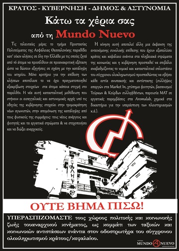 Τα τελευταία χρόνια κράτος και παρακράτος επιτίθενται και απειλούν τις κοινωνικές δομές του κινήματος - καταλήψεις και αυτοδιαχειριζόμενους χώρους. Πιο συγκεκριμενά τις τελευταίες μέρες το τμήμα Προστασίας Πολιτεύματος της Ασφάλειας Θεσσαλονίκης παραδίδει κατ' οίκον κλήσεις σε όλη την Ελλάδα με τις οποίες ζητά από 16 άτομα να προσέλθουν σε προανακριτική εξέταση ώστε να δώσουν εξηγήσεις σε σχέση με την κατάληψη του κτηρίου της ''Mundo Nuevo". Μόνο κριτήριο για την επίδοση των κλήσεων ήταν η εξακρίβωση στοιχείων στα άτομα κάποια στιγμή στο παρελθόν.