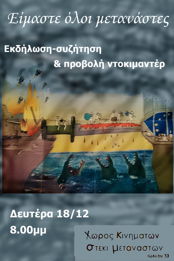Με αφορμή τα παραπάνω, την Δευτέρα 18 Δεκεμβρίου, στις 8.00μμ, ο Χώρος Κινημάτων- Στέκι Μεταναστών (Ιωλκού 33) διοργανώνει την εκδήλωση «Είμαστε όλοι μετανάστες». Στην εκδήλωση θα προβληθούν δύο ντοκιμαντέρ, διάρκειας περίπου μισής ώρα το καθένα, ενώ θα ακολουθήσει σχετική συζήτηση την οποία θα ανοίξει μέλος του Στεκιού.