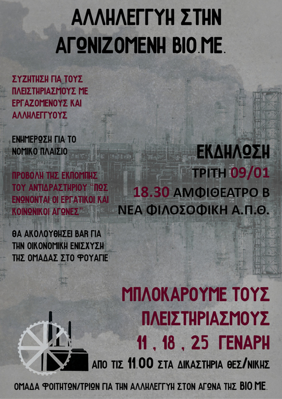 - Στεκόμαστε στο πλευρό του σωματείου εργατουπαλλήλων της ΒΙΟ.ΜΕ. και μπλοκάρουμε κάθε προσπάθεια για πλειστηρισμό 11, 18 και 25 Γενάρη από τις 11 το πρωί στα δικαστήρια Θεσσαλονίκης.