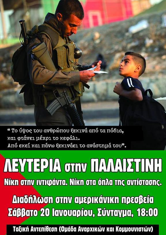 Η αντίσταση του λαού της Παλαιστίνης στη στρατιωτική κατοχή, είναι ένα διαρκές αγκάθι στους διαχρονικούς σχεδιασμούς των παγκόσμιων εξουσιαστών. Οι φτωχοί και αποκλεισμένοι από τα στοιχειώδη Παλαιστίνιοι παρά τις εξοντωτικές πολιτικές που ασκούνται σε βάρος τους δεν παραδίδονται, μάχονται για την ελευθερία και την αξιοπρέπειά τους. Αυτά τα στοιχεία του αγώνα τους θέλουμε να αναδείξουμε ως αναρχικοί, τη δυνατότητα του κατακτημένου να αντεπιτίθεται στον πανίσχυρο κατακτητή, την ικανότητα του φτωχού και του αποκλεισμένου να εξεγείρεται κάτω κι από τις πιο βάρβαρες συνθήκες. Η διεθνής αλληλεγγύη θέλουμε να δημιουργήσει ρήγματα στο εσωτερικό των επιτιθέμενων κυρίαρχων φέρνοντας στο προσκήνιο τη δική μας ιστορία, την ιστορία των αγώνων των από τα κάτω που κόντρα σε όλους τους καιρούς, δημιουργούν τη ζώσα πραγματικότητα της ελευθερίας και της αλληλεγγύης, αποτελώντας το μόνο πραγματικό ανάχωμα στην επέλαση του σύγχρονου ολοκληρωτισμού.