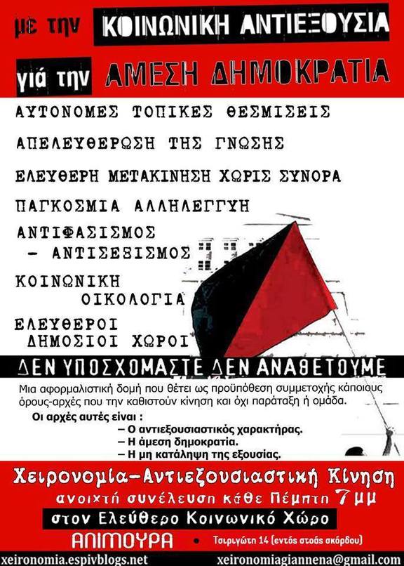The Antiauthoritarian Movement was created in 2002 with central objective to participate in the mobilisations adversely in the Summit of European Union during June 2003 in the city of Thessaloniki.