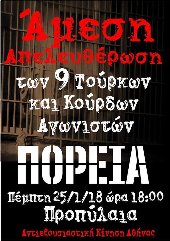 ΟΧΙ ΣΤΗΝ ΕΚΔΟΣΗ - ΑΜΕΣΗ ΑΠΕΛΕΥΘΕΡΩΣΗ ΤΩΝ 9 ΑΓΩΝΙΣΤΩΝ ΠΟΛΙΤΙΚΩΝ ΠΡΟΣΦΥΓΩΝ ΑΠΟ ΤΗΝ ΤΟΥΡΚΙΑ: Πέμπτη 25 Γενάρη στις 18.00, Συγκέντρωση στα Προπύλαια και Διαδήλωση στη Βουλή και την Τουρκική Πρεσβεία.