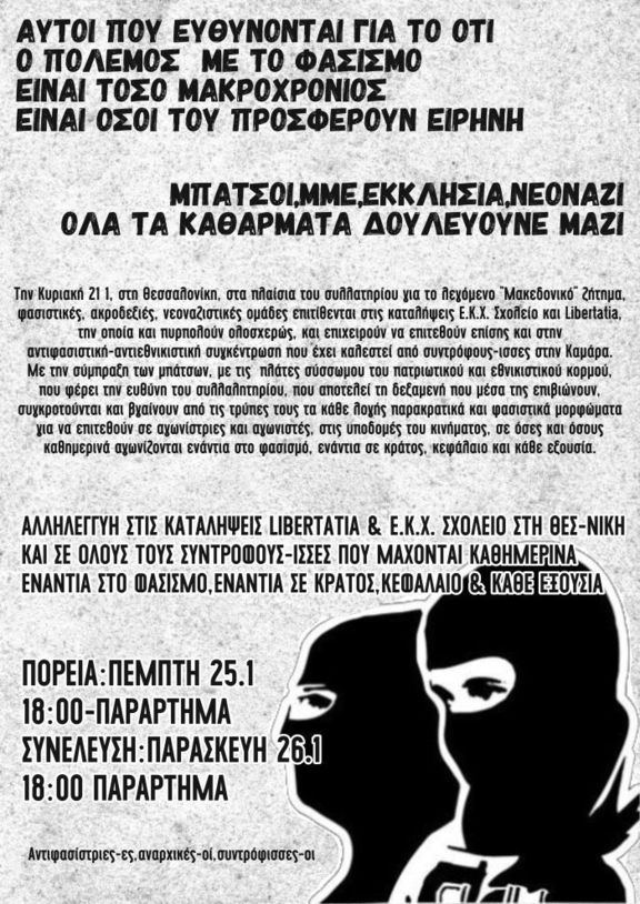 Την Κυριακή 21 Γενάρη καλέστηκε στην Θεσσαλονίκη συλλαλητήριο για το λεγόμενο «Μακεδονικό ζήτημα». Στο συλλαλητήριο αυτό παρευρέθηκε σύσσωμος ο πατριωτικός και εθνικιστικός κορμός, υπό την διαρκή στήριξη τοπικών και όχι μόνο Μ.Μ.Ε. τα οποία συστηματικά ρίχνουν νερό στο μύλο του εθνικιστικού και μισαλλόδοξου παραληρήματος που επικρατεί τις τελευταίες μέρες. Στο πλαίσιο αυτό φασιστικές, ακροδεξιές και νεοναζιστικές ομάδες, σάρκα από τη σάρκα των συγκεντρωμένων, αποκόπτονται από το συλλαλητήριο και επιχειρούν -πάντα με την κάλυψη των μπάτσων- επίθεση με πέτρες στην κατάληψη Ε.Κ.Χ. Σχολείο. Αφού η επίθεση απωθήθηκε από την περιφρούρηση της κατάληψης επιχειρούν δύο φορές επί της κατάληψης Libertatia η οποία τελικά καίγεται ολοσχερώς, ενώ επίσης προσπάθησαν ανεπιτυχώς να προσεγγίσουν την αντιφασιστική-αντιεθνικιστική συγκέντρωση που είχε καλεστεί από συντρόφους-ισσες στην Καμάρα.