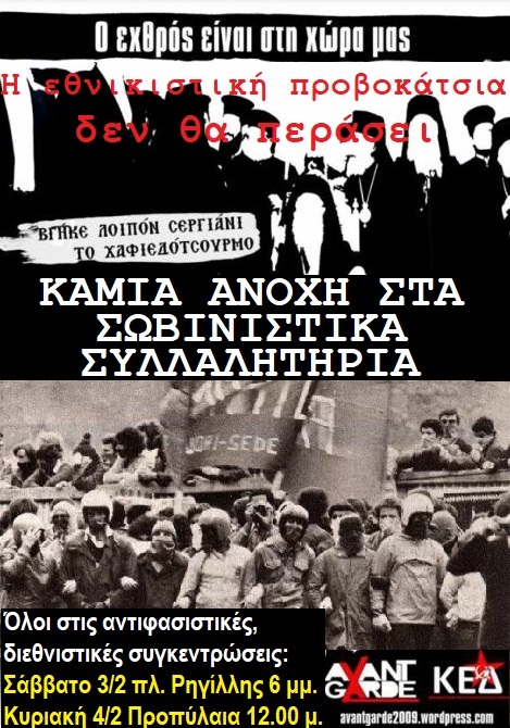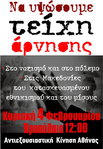 Την Κυριακή 4 Φεβρουαρίου διοργανώνεται στην Αθήνα συγκέντρωση στην πλατεία Συντάγματος από δυνάμεις που επιχειρούν να επιβάλουν κοινωνικά την εθνικιστική πολιτική ατζέντα του κράτους με βάση το «μακεδονικό», σε συνέχεια αντίστοιχης συγκέντρωσης στη Θεσσαλονίκη. Δυνάμεις που συμπεριλαμβάνουν από συλλόγους, κομματικούς μηχανισμούς της Νέας Δημοκρατίας και των συγκυβερνώντων με το ΣΥΡΙΖΑ, ΑΝΕΛ, εκκλησιαστικές οργανώσεις, μέχρι τη ναζιστική οργάνωση της Χρυσής Αυγής και που εγκολπώνουν φασιστικές ομάδες κρούσεις στις τάξεις τους, σε μία κίνηση που αντικειμενικά λειτουργεί ως ιμάντας διάχυσης της μισαλλοδοξίας και ως πόλος συσπείρωσης και κινητοποίησης αντιδραστικών αντανακλαστικών.