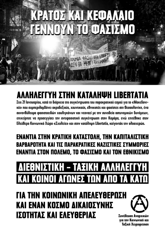 Στις 21 Γενάρη, κατά τη διάρκεια εθνικιστικής κινητοποίησης στη Θεσσαλονίκη, κάηκε η αναρχική κατάληψη Libertatia από εμπρηστική επίθεση φασιστών. Λίγο νωρίτερα είχε προηγηθεί επίθεση στην κατάληψη ΕΚΧ Σχολείο η οποία αποκρούστηκε από συντρόφους που την περιφρουρούσαν. Τα πολιτικοοικονομικά παζάρια του ελληνικού κράτους έβγαλαν στην επιφάνεια τη φασιστική συγκρότηση του πυρήνα του και της ιστορίας του. Μέσα από την επιστροφή μιας διπλωματικής διαμάχης σχετικά με το όνομα της Μακεδονίας, στο πλαίσιο της επεκτατικής πολιτικής του νατοϊκού μπλοκ εξουσίας και του ελληνικού εθνικισμού-καπιταλισμού, συσπειρώθηκε ένας συρφετός κρατικών και παρακρατικών μηχανισμών και υποκειμένων ταυτισμένων με το μύθο της εθνικής κυριαρχίας. Ο εθνικισμός ξεμύτησε για ν' ανοίξει δρόμο για τον κρατικό ολοκληρωτισμό. Αιχμή της κινητοποίησης ήταν οι ομάδες που εκτέλεσαν τις επιθέσεις στις καταλήψεις.