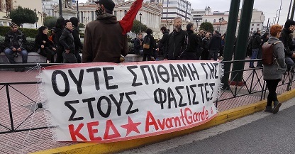 Η ΚΕΔ συμμετείχε στο μέτρο των δυνάμεών της στις αντιφασιστικές κινητοποιήσεις του διημέρου. Σε μια απ' αυτές το βράδυ του Σαββάτου 2/2, συνελήφθη ο σ. Παναγιώτης Π. κατά τη διάρκεια αντιφασιστικής πορείας στους δρόμους του ιστορικού κέντρου της Αθήνας. Η πορεία πραγματοποιήθηκε κάτω από την ασφυκτική πίεση διμοιριών των ΜΑΤ που επιτέθηκαν απρόκλητα με χειροβομβίδες κρότου- λάμψης, λίγο πριν την πλ. Κλαυθμώνος επί της οδού Ευριπίδου. Στο σημείο αυτό συνελλήφθη ο σ. Παναγιώτης με ένα κατασκευασμένο κατηγορητήριο που περιλαμβάνει: διατάραξη κοινής ειρήνης, αντίσταση κατά της αρχής, επικίνδυνες σωματικές βλάβες, απόκρυψη χαρακτηριστικών και νόμος περί όπλων. Τη Δευτέρα 5/2 περνάει από το αυτόφωρο.
